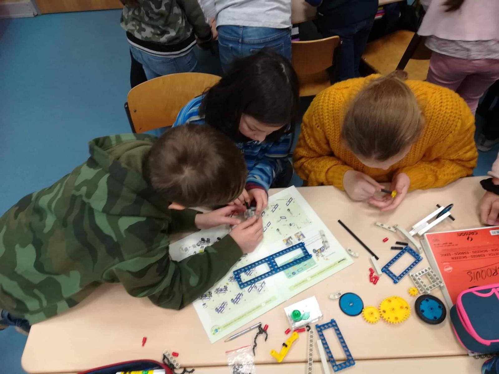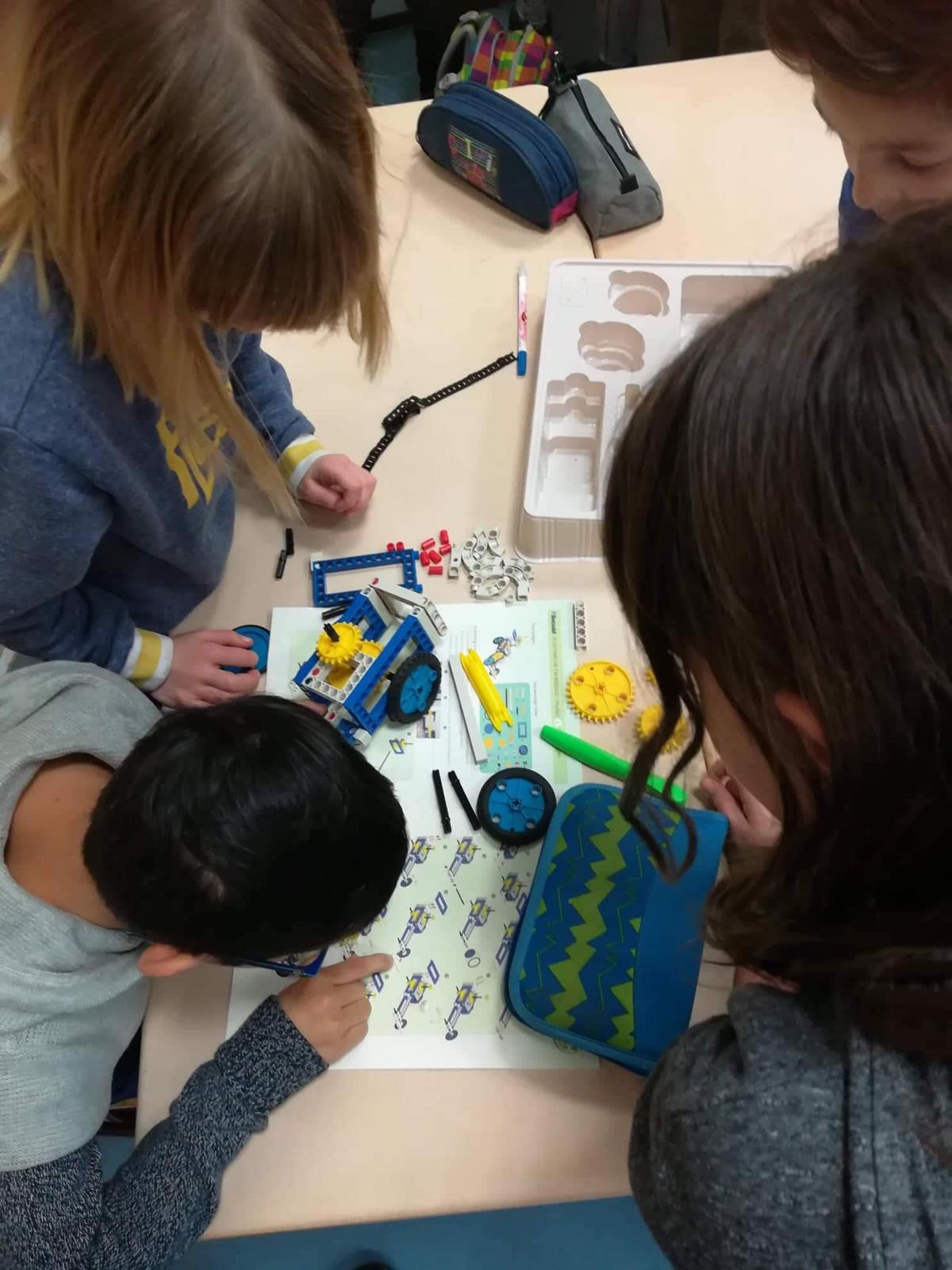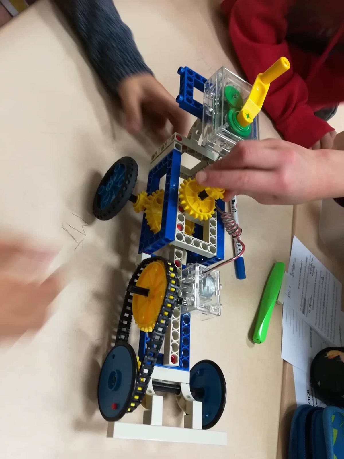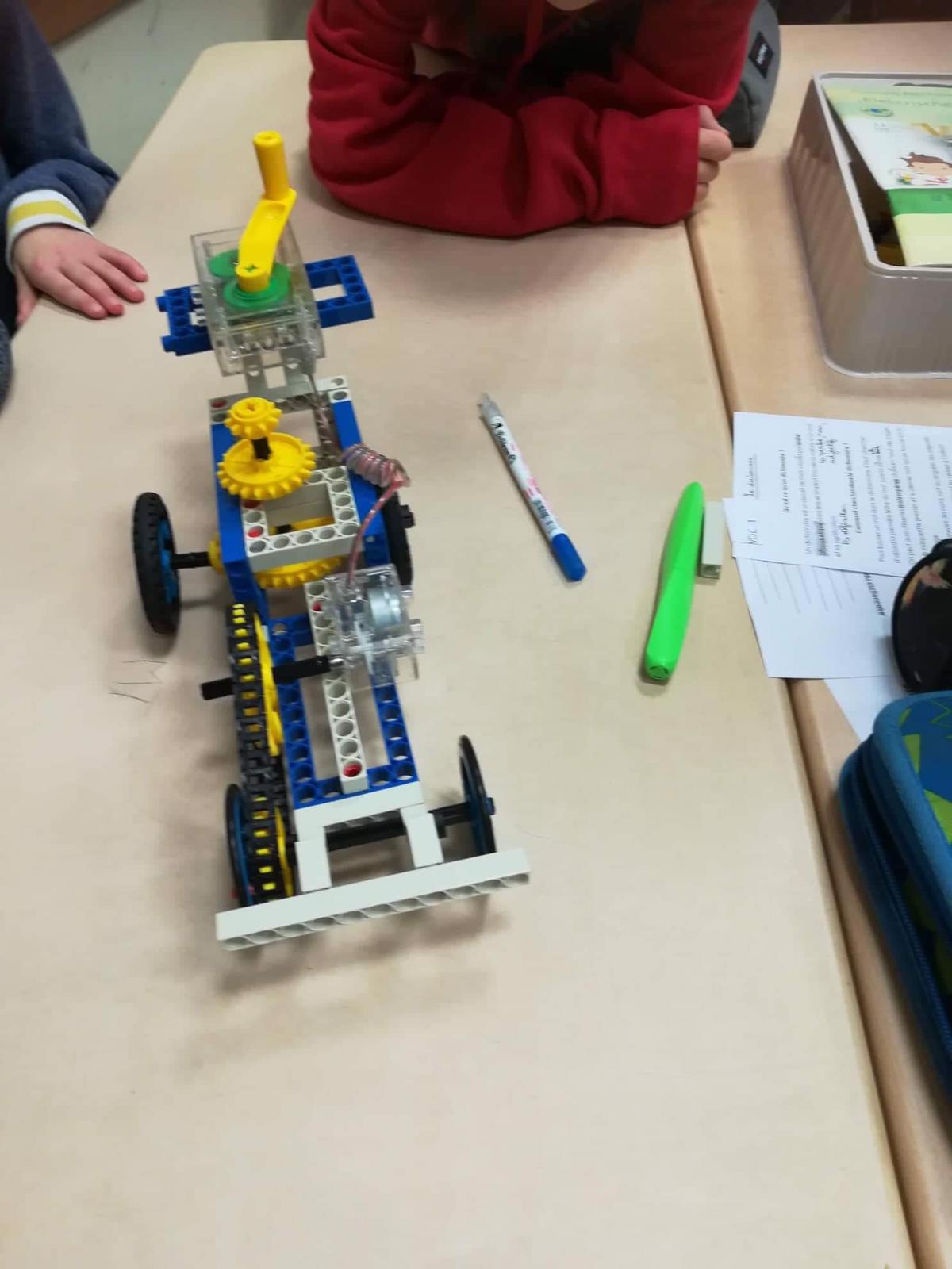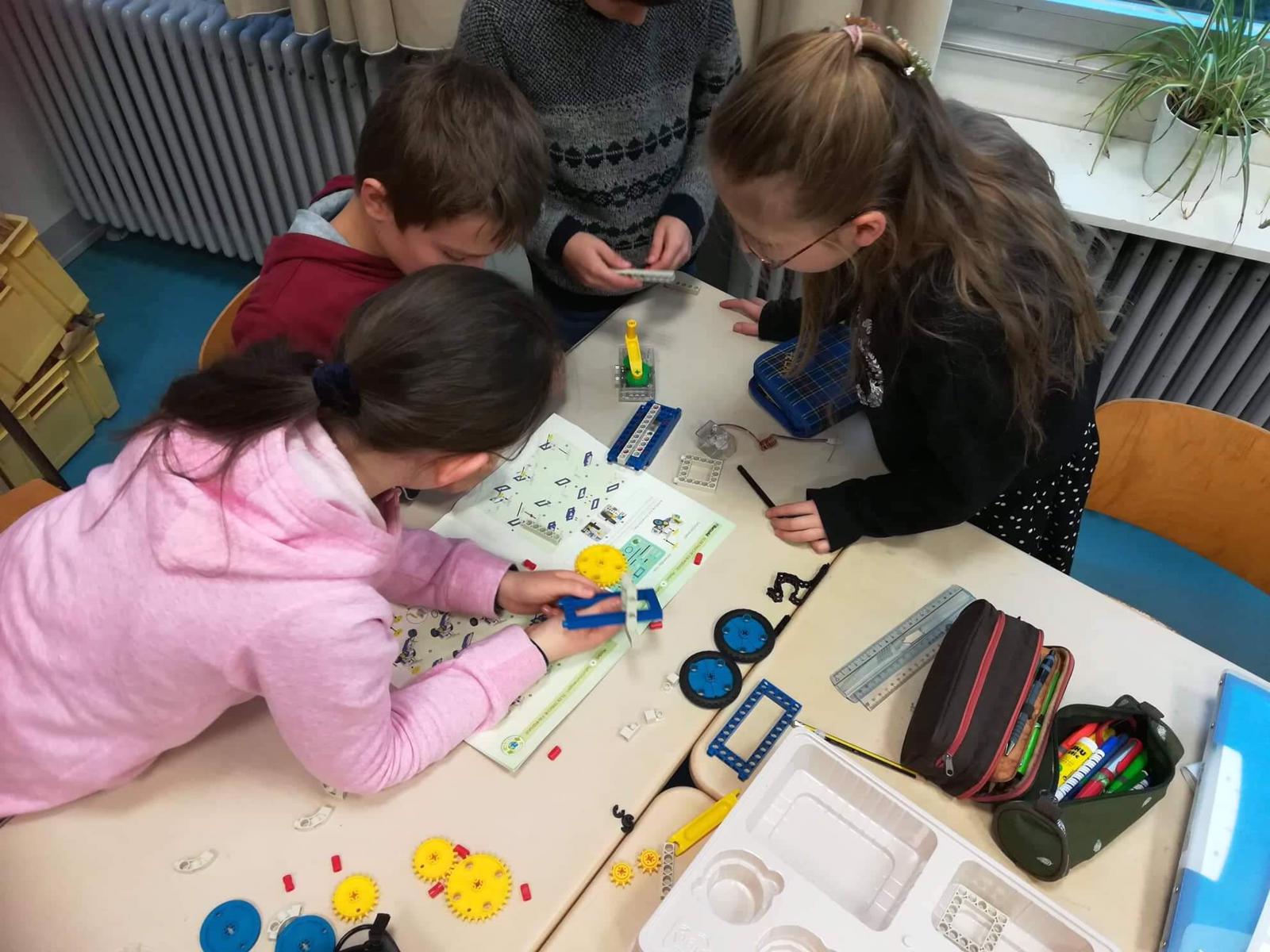 Séance de Sachkunde mardi 7 janvier 2020, où les élèves de CM2 de Madame Bréant ont eu l’occasion de mettre en application la leçon sur les engrenages en construisant, par petits groupes, des véhicules d’après une notice en allemand …