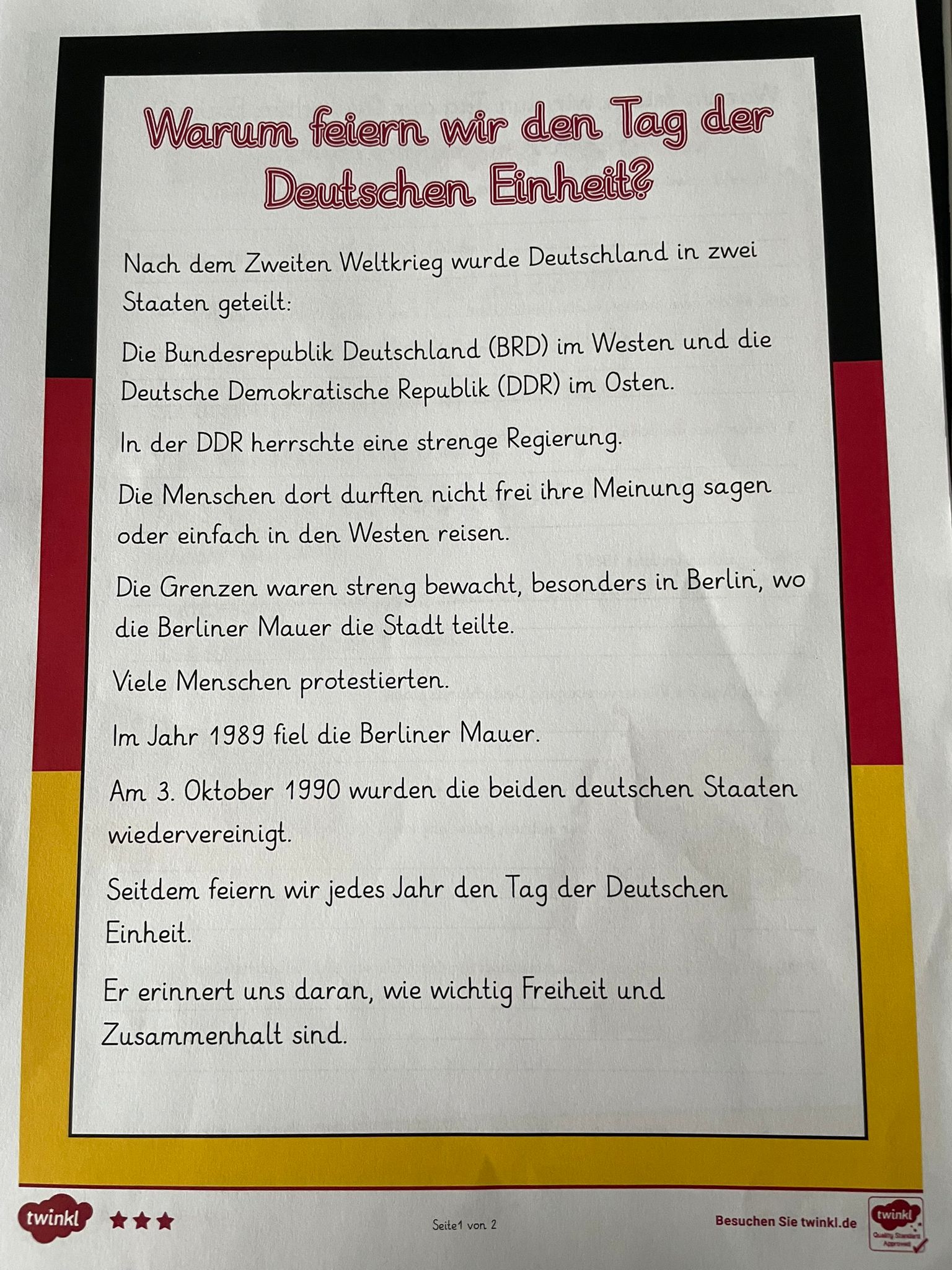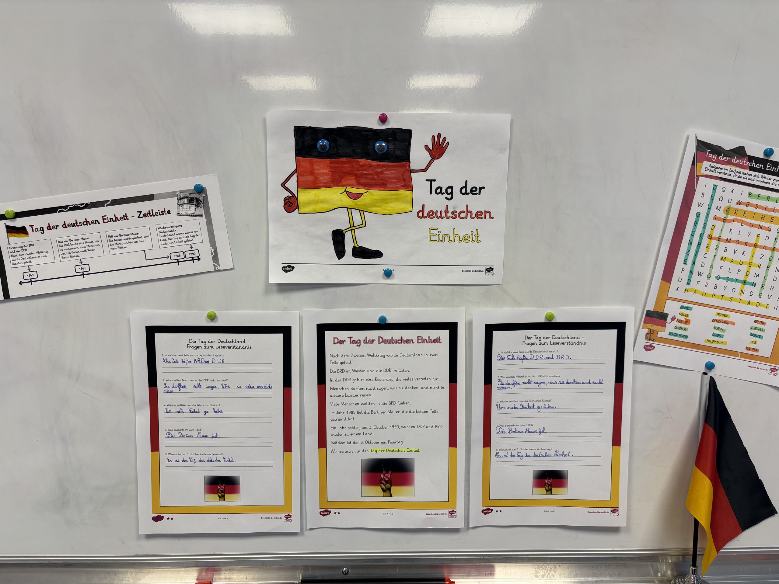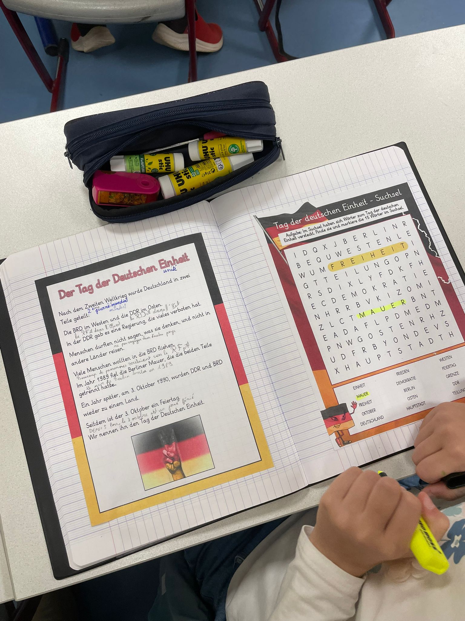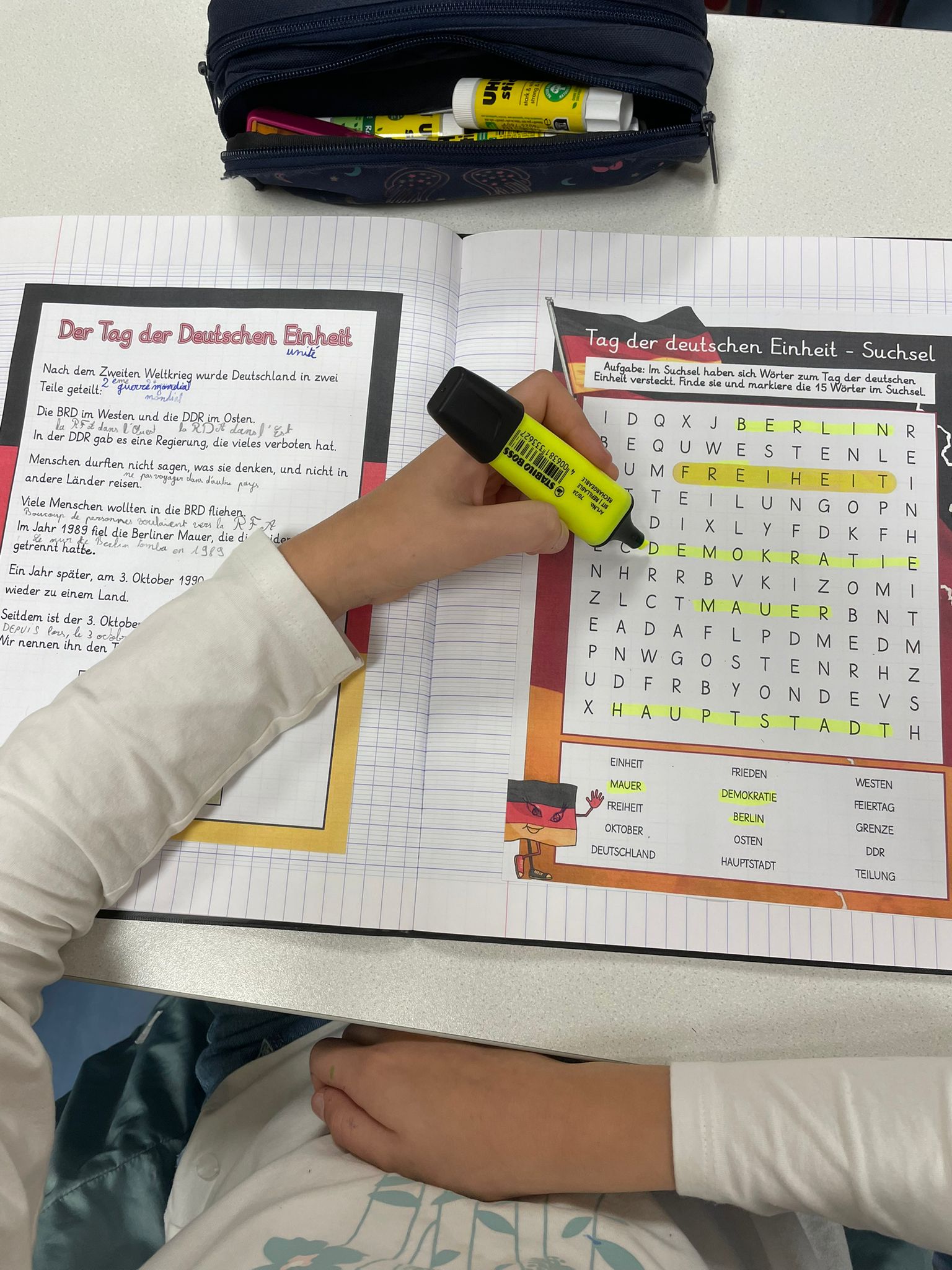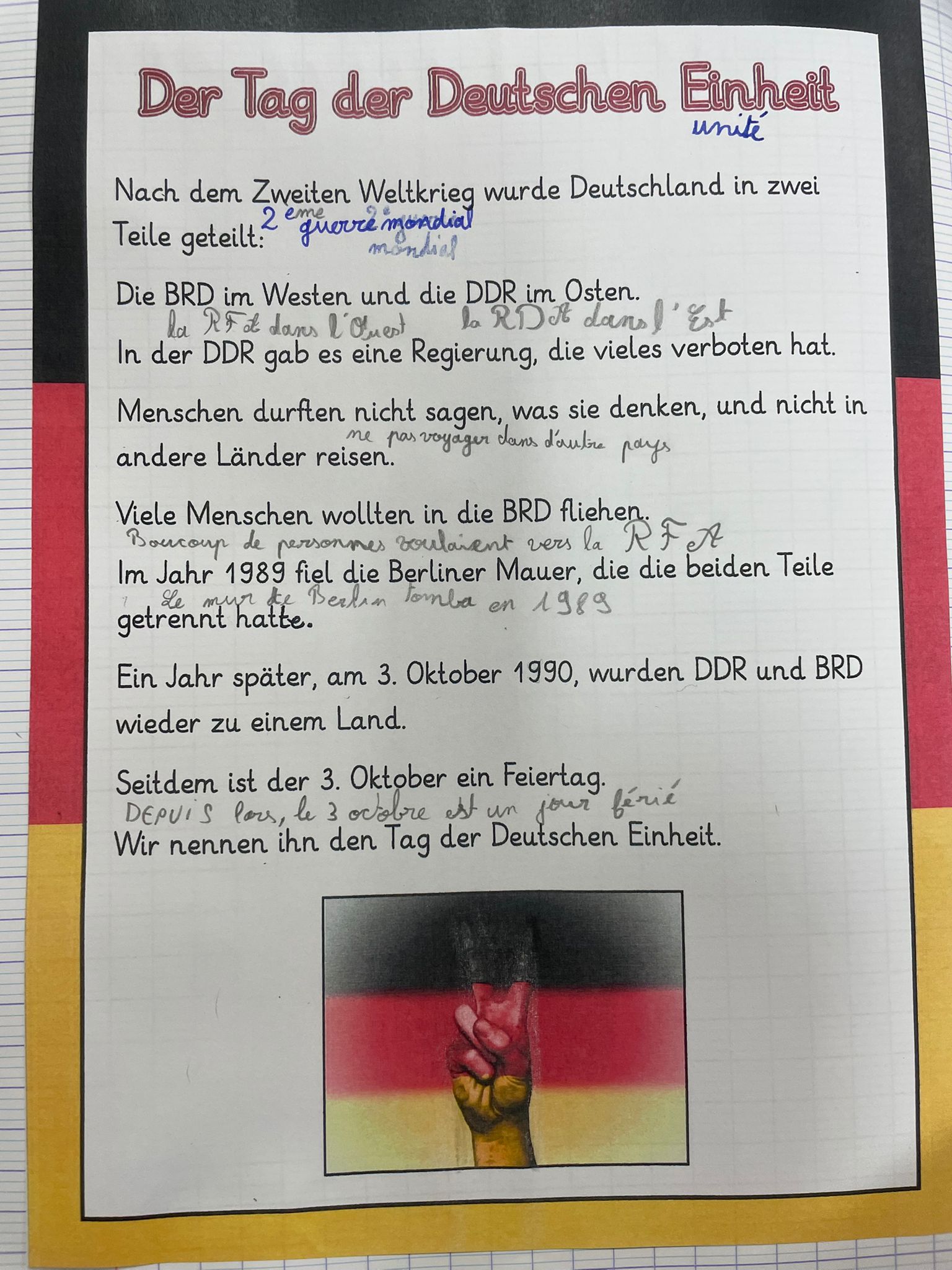 Pour marquer cet événement marquant de l’histoire de l’Allemagne, les élèves des groupes d’allemand de Mme Didier et de Mr Heitz ont mené différentes activités en classe : lecture et compréhension de texte, mots mêlés, réalisation d’une frise chronologique et visionnage d’une vidéo.