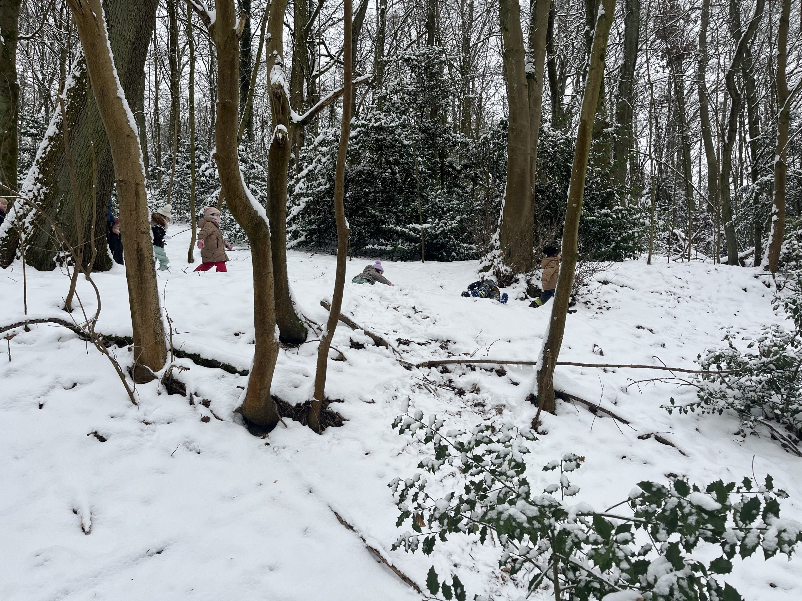 Pour la première sortie en forêt de l’année, le 08.01.2026, les élèves de maternelle de la classe de Mme Roos ont eu la chance de découvrir un paysage transformé par la neige. Dès leur arrivée, l’émerveillement était visible sur tous les visages : la forêt semblait silencieuse, blanche et magique. Les enfants ont pris le temps d’observer leur environnement, de toucher la neige froide, de regarder les arbres recouverts de givre et de repérer les traces laissées par les animaux.